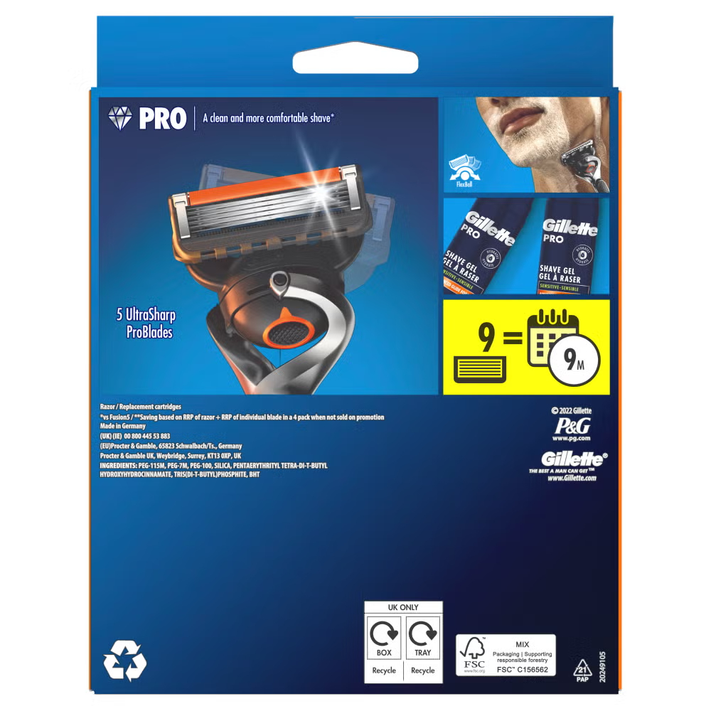Experience closeness and comfort with the ProGlide Value Pack, containing 1 Gillette ProGlide Razor in sustainable packaging and 9 cartridges with our sharpest (*blades 1 to 4), long-lasting blades. The razor’s handle has a FlexBall pivot to help navigate facial contours, while the 5-blade head offers many of Gillette’s top features, including a microcomb to guide hairs to the blades and a precision trimmer.