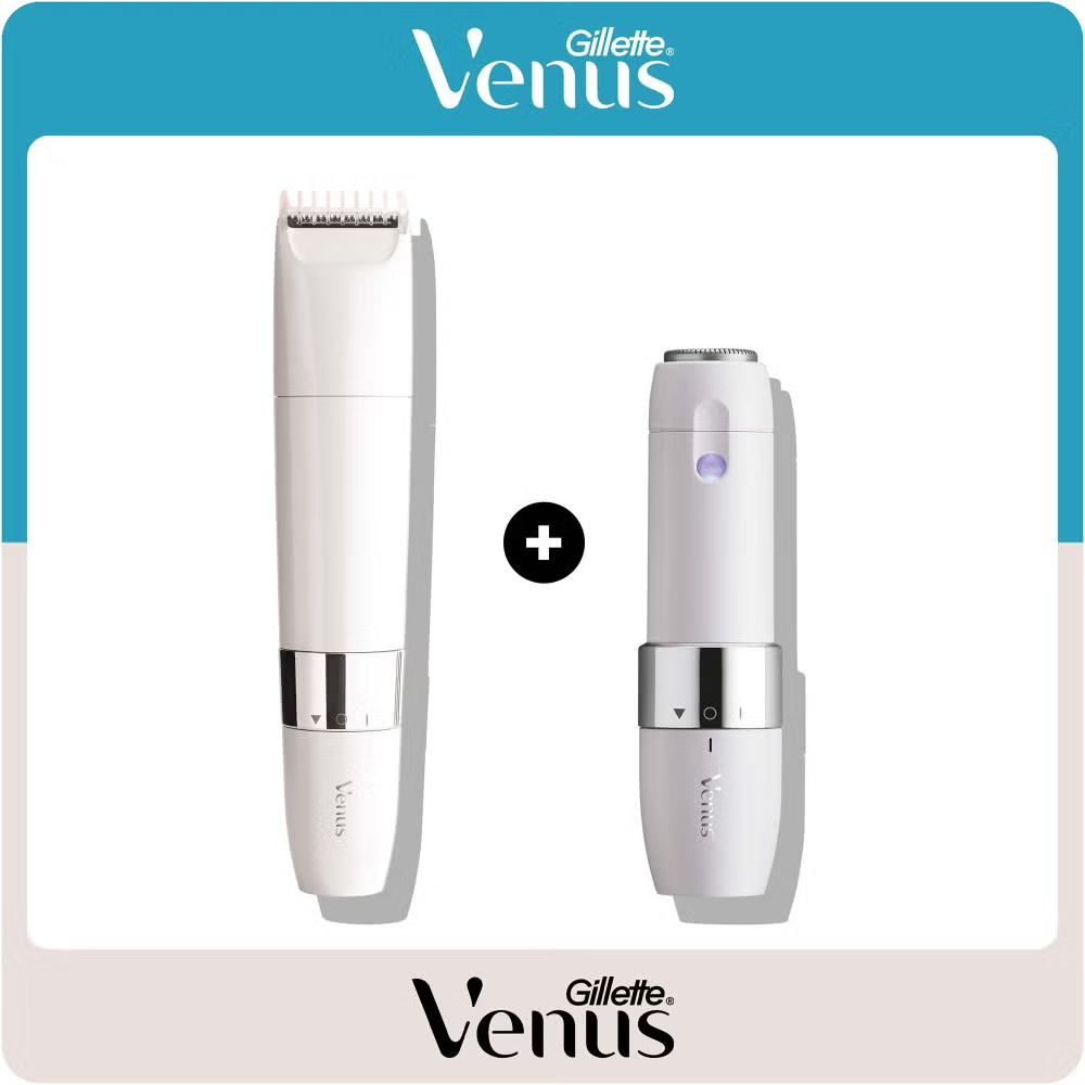 This kit contains two trimmers. One can be used to prep your bikini area for shaving or as a neat trimmer on its own, as preferred. The other is designed to offer the best facial hair removal for women from Gillette Venus in between dermaplaning at home sessions, ideal for touching up uneven regrowth, for example. The bikini trimmer is part of the Gillette Venus Pubic Hair & Skin range while the facial hair trimmer is part of our Facial Hair & Skin Care collection. Together, they provide everything needed for quick, safe and convenient trims to your face or body.