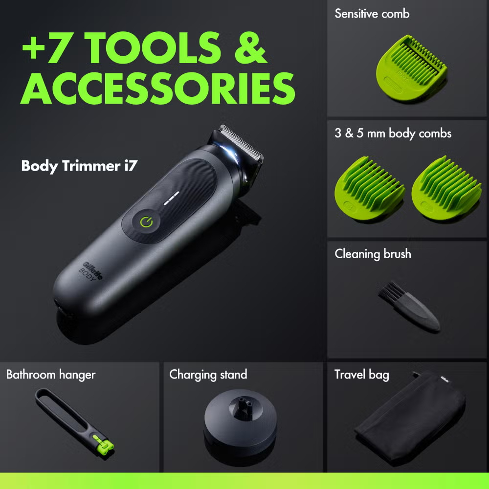 Man trims his stomach with i7 Body Trimmer with Gillette's safest body trimmer technology.GilletteLabs Body i7 Trimmer with text about features such as SkinFirst Technology.Lower part of GilletteLabs Body i7 Trimmer that is waterproof and has a charging stand.Man trimming intimate area, chest, and underarm with GilletteLabs Body i7 Trimmer.