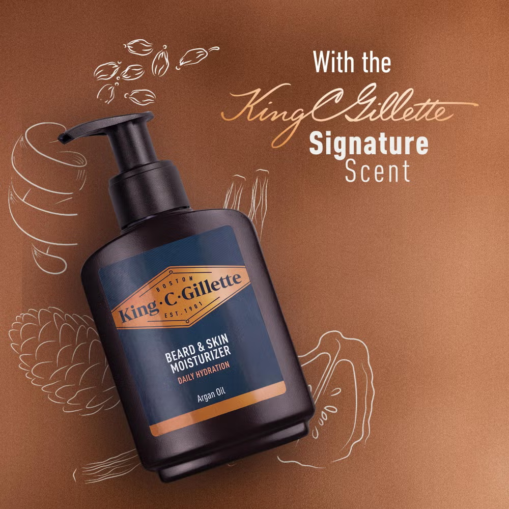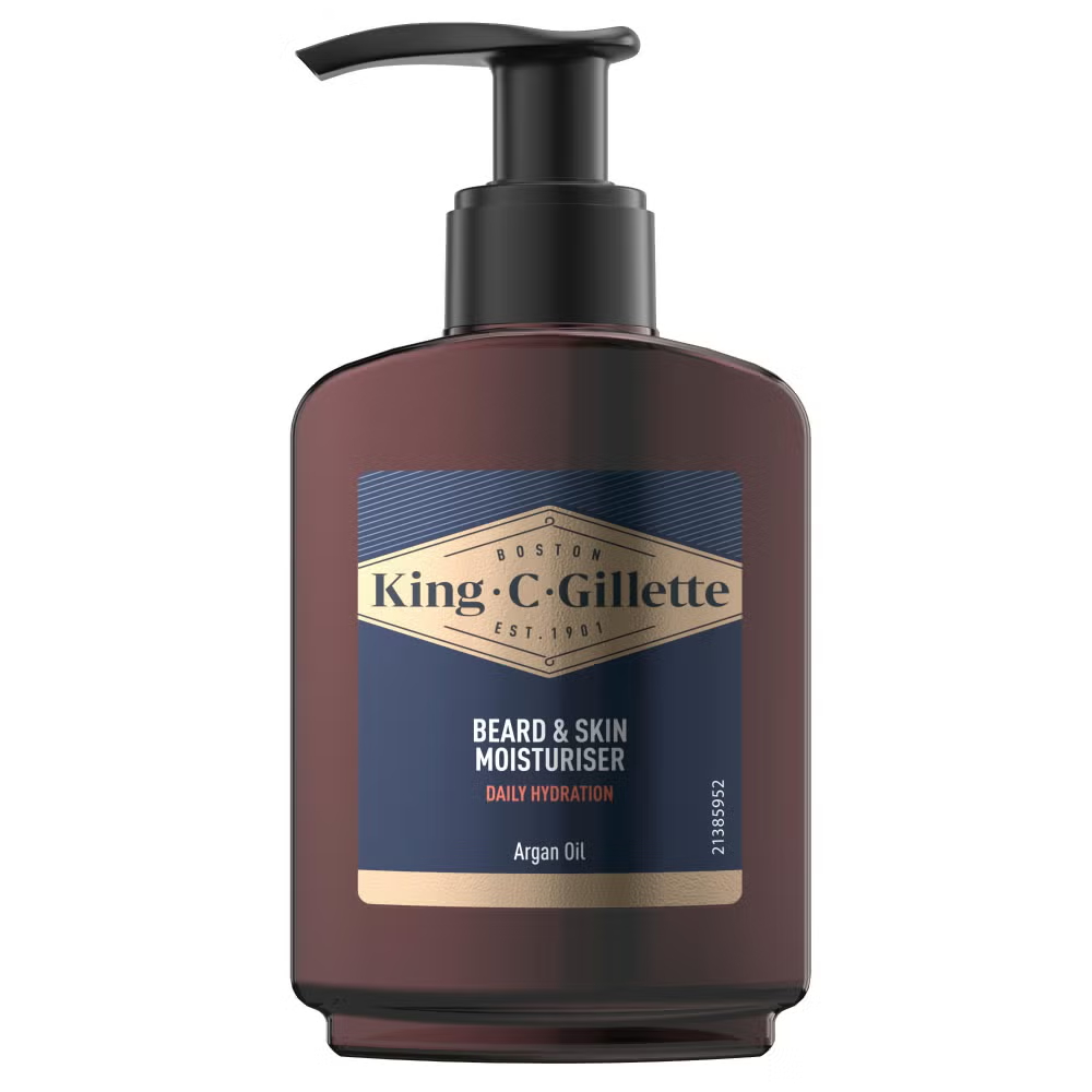 Gillette is dedicated to facial hair care, and King C. Gillette Moisturiser plays a key part in helping you look your best. Helping to maintain the skin’s natural moisture barrier, it moisturises the skin to soothe and relieve signs of dryness and skin irritation. Emollients like dimethicone and argan oil leave skin and hair feeling soft, smooth and comfortable, while glycerine binds water in the upper layers of the skin to provide immediate and long-lasting hydration. Formulated with Vitamin B complex – including Provitamin B5 (panthenol) and Vitamin B3 (niacinamide) – and scented with King C. Gillette’s bold and masculine signature scent, the lightweight and non-greasy formula helps you to enjoy healthy-looking skin and beard hair when used as part of a daily facial care regime.