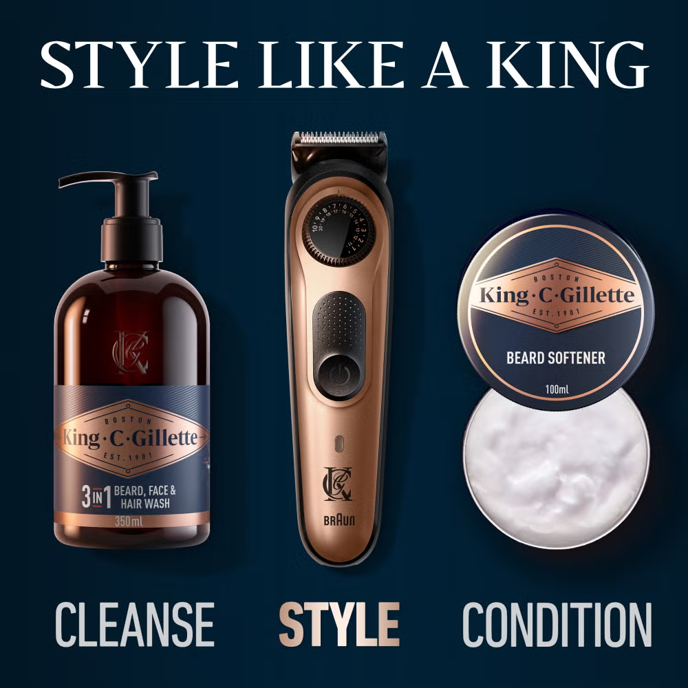Trim, shave, shape, style, nourish and tame beard hair with the King C. Gillette Beard Trimmer, King C. Gillette Double Edge Safety Razor, King C. Gillette Beard and Face Wash, King C. Gillette Beard Oil and King C. Gillette Beard Balm.