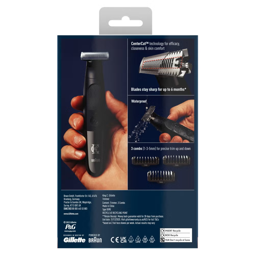 The King C. Gillette Style Master is 1 simple tool offering 3 stubble styling options. As a unique asset for self-expression, choosing a stubble style allows for creativity, with many men switching between styles depending on the occasion. With 3 combs to help you sculpt an individual look, 4 cutting elements designed to trim different hair lengths, and a pivoting head that adapts to the face’s contours, the Style Master gives you the flexibility to master your stubble style with ease. The slim, compact handle comes with a 360° rubber surface for great grip and control, and it’s also fully waterproof for easy cleaning under running water. With cordless power and one charge providing 45 minutes of trimming time, this is a versatile and convenient tool for men who want to trim, edge and shave.