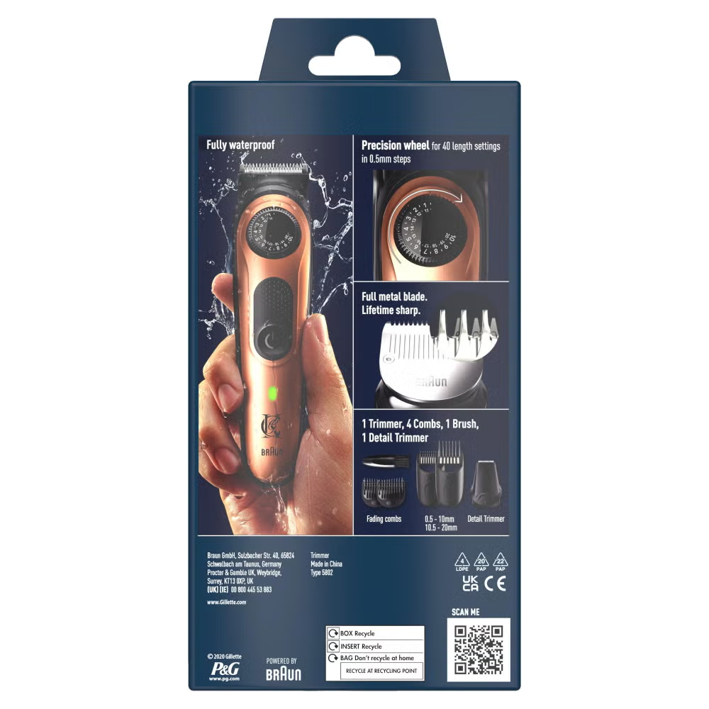 This beard trimmer Pro with a brush from the King C. Gillette range of beard trimmers offers everything you need for professional standard trims and facial hair styling. The full metal head with self-sharpening blades benefits from auto-sensing technology which adjusts the power delivered to the blades up to 13 times per second. In short, if you want to ensure constant cutting performance from a beard trimmer for men that’s been designed for precision grooming, then this King C. Gillette beard trimmer is for you. The two supplied combs allow for multiple length settings, from 0.5 mm to 21 mm, and the beard trimmer’s cleaning brush makes maintaining your unit a breeze.