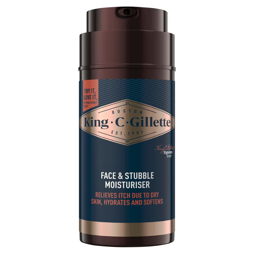 King C. Gillette products including 3-in-1 beard wash, razor, beard trimmer, face moisturizer, beard thickener, and beard softener.