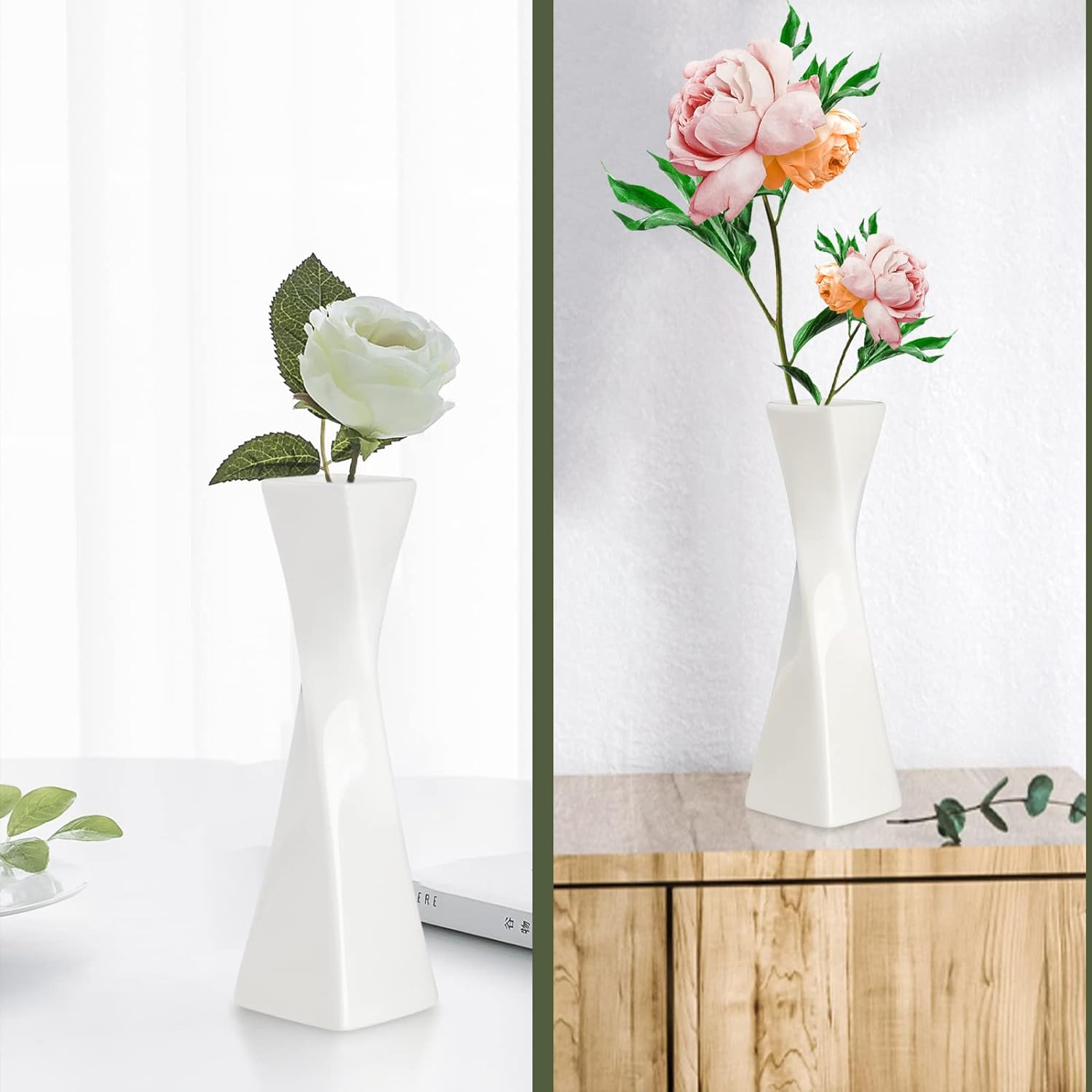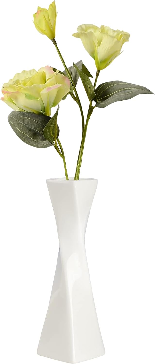 - High Quality : This ceramic bud vase for flower were made of high quality white bone china, texture uniform, special twist design. It glazed with elegant, classic colors.