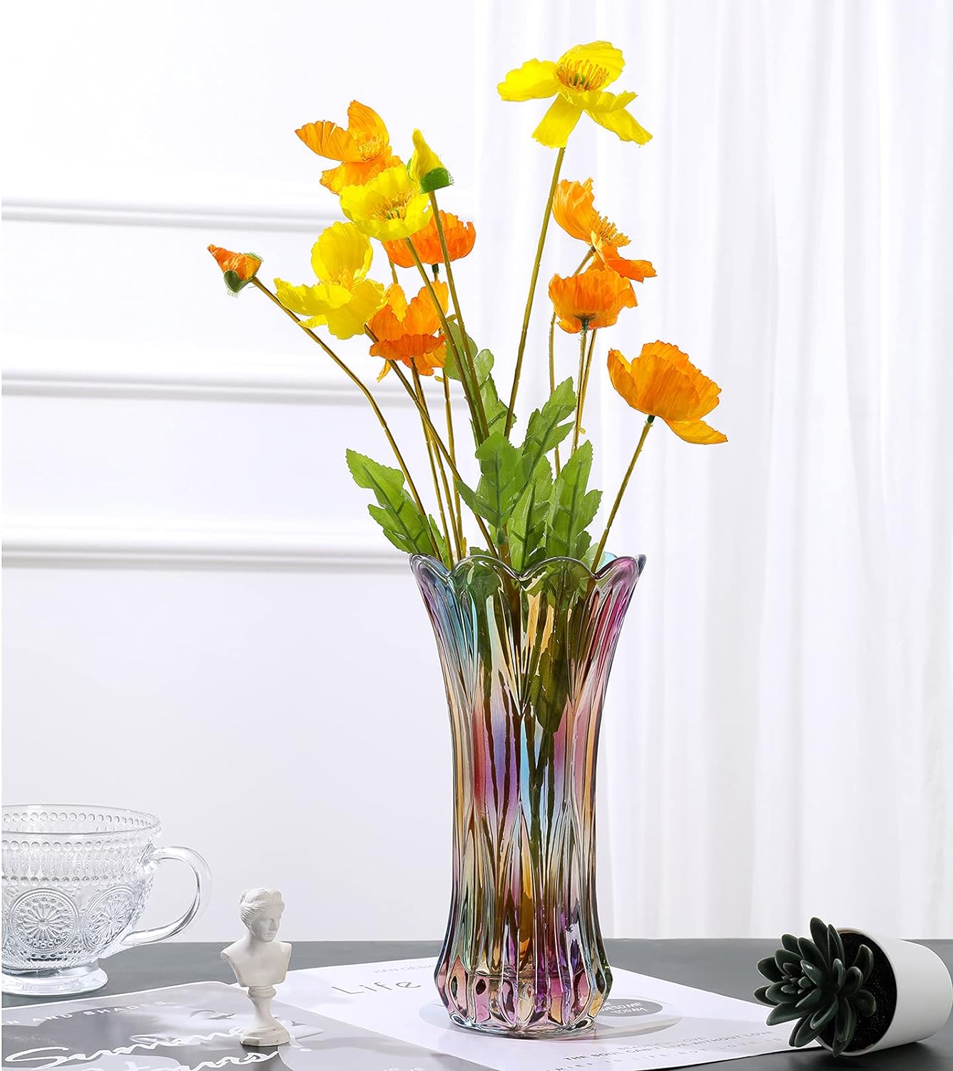 - ⭐Design:Cylindrical decorative glass vase, a riot of colour,hthe uniquely designed phoenix tail pattern adds decorative beauty
