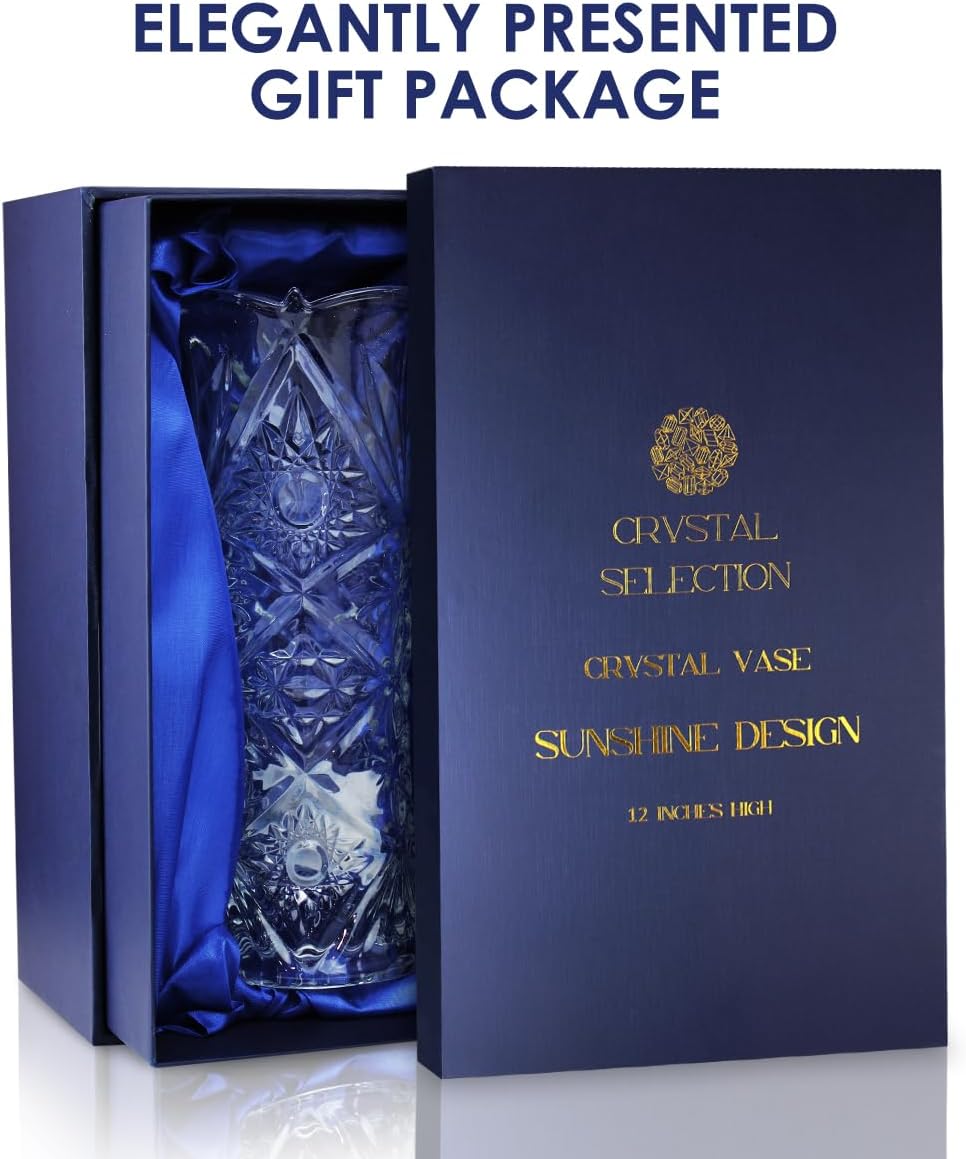 CS Crystal Vase 12-inch high, Sunshine Design, for Flowers & Decor. Lovely Nice Shiny Piece. Perfect as a Gift, Suitable for All Occasions.