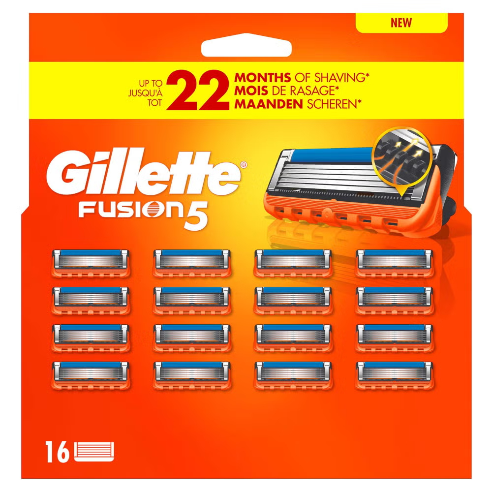 Part of our wider range of Gillette razors, blades and trimmers, this 16-pack of Gillette Fusion5 razor blades provides exceptional value. With a value pack of 16 Gillette Fusion5 razor blades, men can benefit from anti-friction technology for close shaves that last. These refills are compatible with other Gillette handles which accept five-bladed cartridges, such as the Gillette ProGlide, so you don’t need a Fusion5 handle to use them.