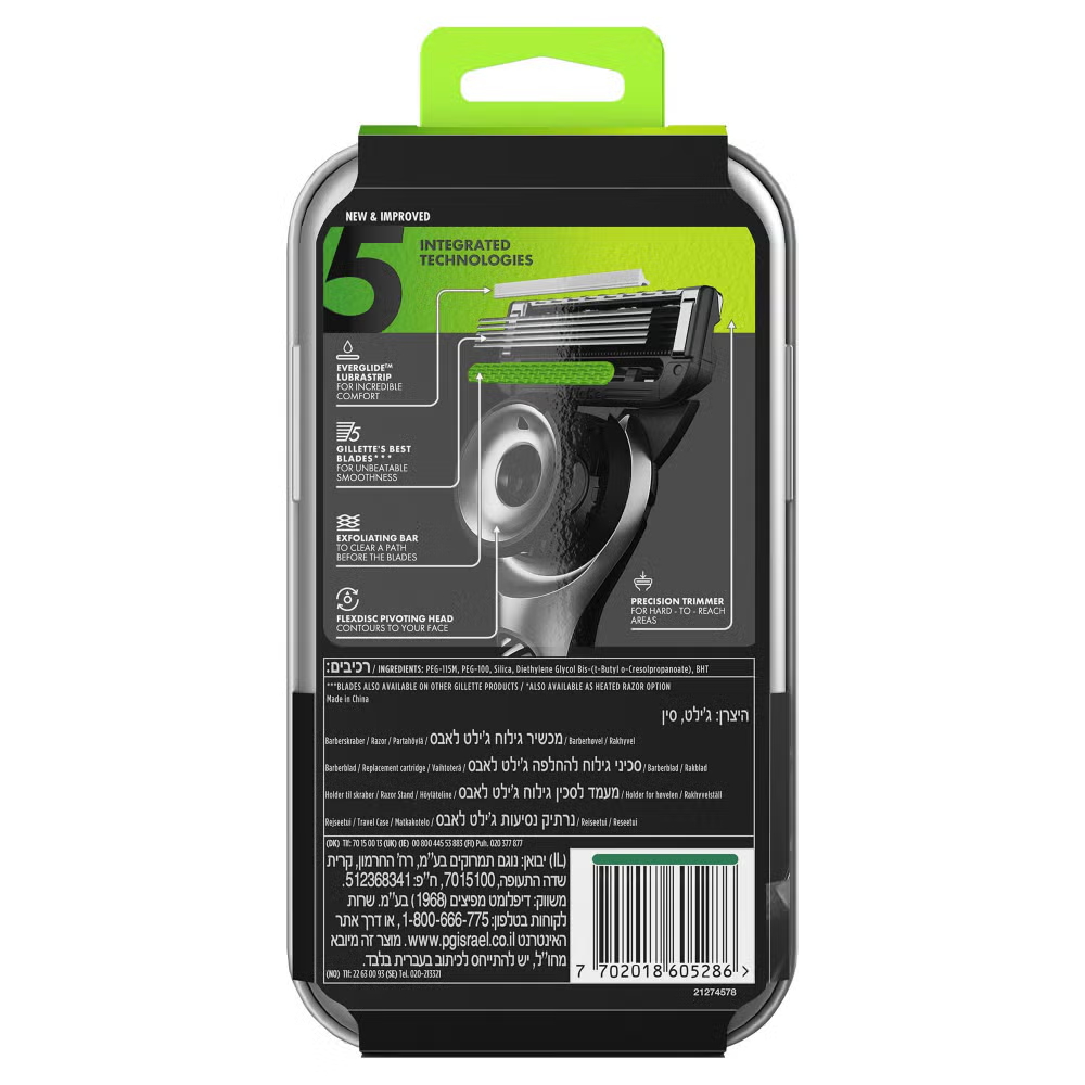 Gillette Labs razor with exfoliating bar, promising effortless shaving in one stroke, backed by a lifetime warranty.Gillette razor featuring an exfoliating bar to help prepare skin for a smooth and efficient shave.Gillette razor with green arrows indicating adaptive design and 2D FlexDisc for contact and comfort.Gillette razor cartridge highlighting the 5 sharp blades, specially designed for incredible closeness and comfort.Gillette razor hovering above its magnetic stand, designed to keep the razor clean, dry, and ready for use.